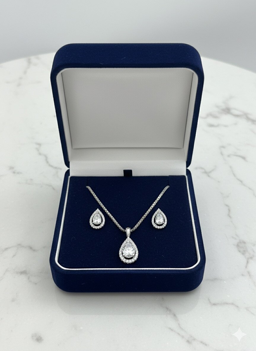 Élégante parure composée d'un collier et de boucles d'oreilles en argent avec pendentifs en forme de goutte. Idéale pour les occasions spéciales ou comme cadeau raffiné. Offrez un éclat de sophistication et de style.