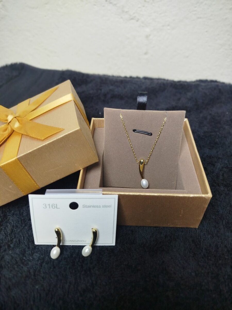 Découvrez notre élégante parure en acier inoxydable, composée d'un collier doré et de boucles d'oreilles assorties, ornée de délicates perles blanches. Parfait pour rehausser vos tenues, ce set est idéal pour les occasions spéciales et les cadeaux. Conçu pour durer et briller.