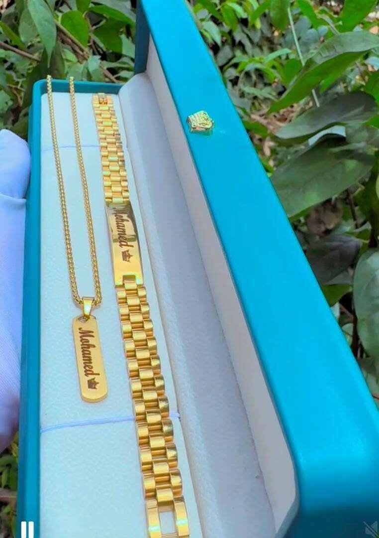 Élégante parure comprenant un collier et un bracelet dorés. Parfaite pour ajouter une touche chic à votre tenue quotidienne ou pour des occasions spéciales. Design luxueux et moderne adapté à tout style.