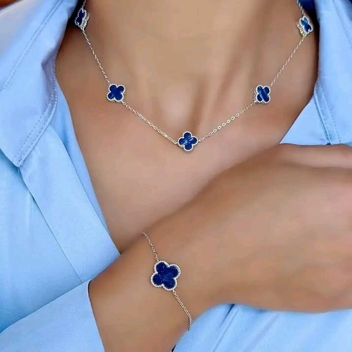 Élégante parure comprenant un collier et un bracelet en argent ornés de pendentifs en forme de trèfle bleu. Parfaits pour ajouter une touche de sophistication à vos tenues quotidiennes ou de soirée. Un cadeau idéal pour une personne spéciale ou pour soi-même.