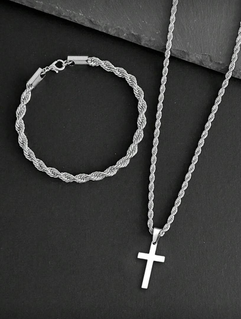 Parure élégante en acier inoxydable comprenant un collier avec pendentif croix et un bracelet assorti. Résistant et intemporel, idéal pour un style moderne et affirmé. Parfait pour toutes les occasions, ce set est un cadeau idéal pour soi ou pour offrir.
