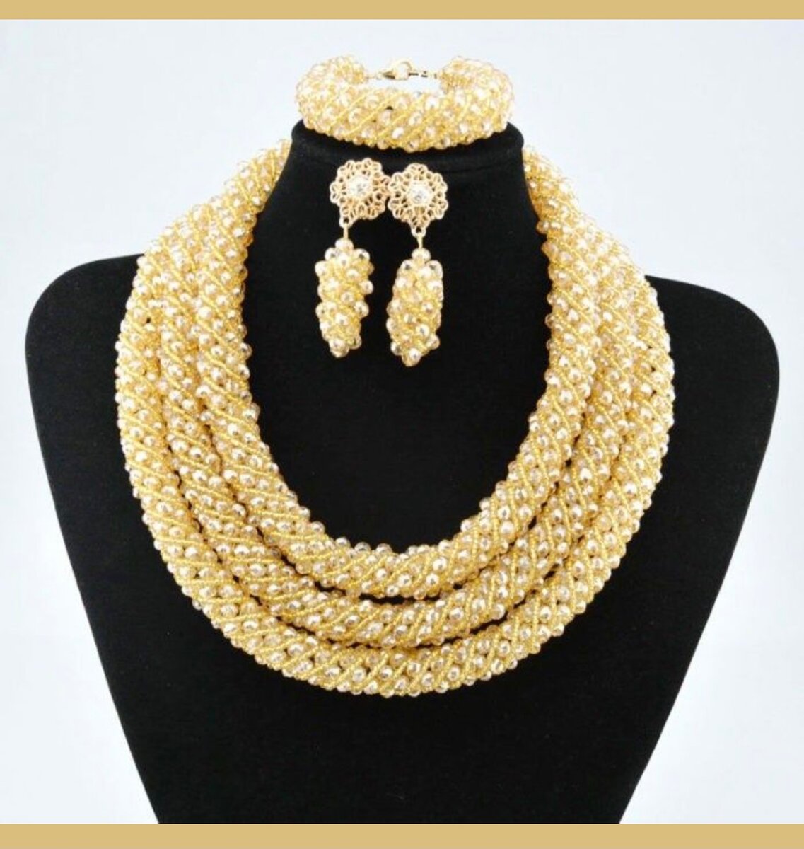 Sublimez votre tenue avec cette parure de bijoux dorés, parfaite pour les occasions spéciales. Comprend un collier, un bracelet et des boucles d'oreilles assortis. Design luxueux et raffiné pour un look inoubliable. Idéal pour mariages, soirées et événements.