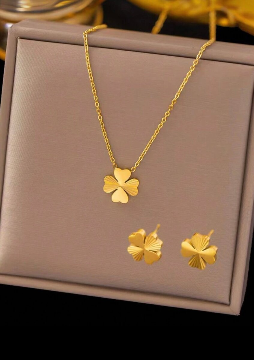 Découvrez cette élégante parure composée d'un collier et de boucles d'oreilles en forme de trèfle, fabriqués en or. Parfaite pour les femmes qui aiment les bijoux raffinés et symboliques, cette parure ajoute une touche de sophistication à toute tenue. Idéale pour les occasions spéciales ou comme cadeau.
