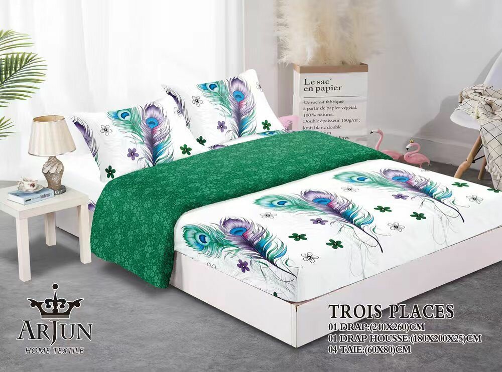 Apportez une touche d'élégance à votre chambre avec cette parure de lit trois places. Confectionnée en tissus de qualité et ornée de motifs de plumes colorées, elle assure confort et style. Idéale pour un sommeil réparateur, elle est parfaite pour embellir tout espace.