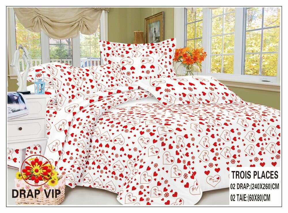 Transformez votre chambre avec cette parure de lit à motifs cœurs. Comprend une housse de couette de 240x260 cm et deux taies d'oreiller 60x80 cm. Facile d'entretien et idéal pour ajouter de la chaleur romantique à votre espace. Parfait pour offrir ou pour rafraîchir votre décor.