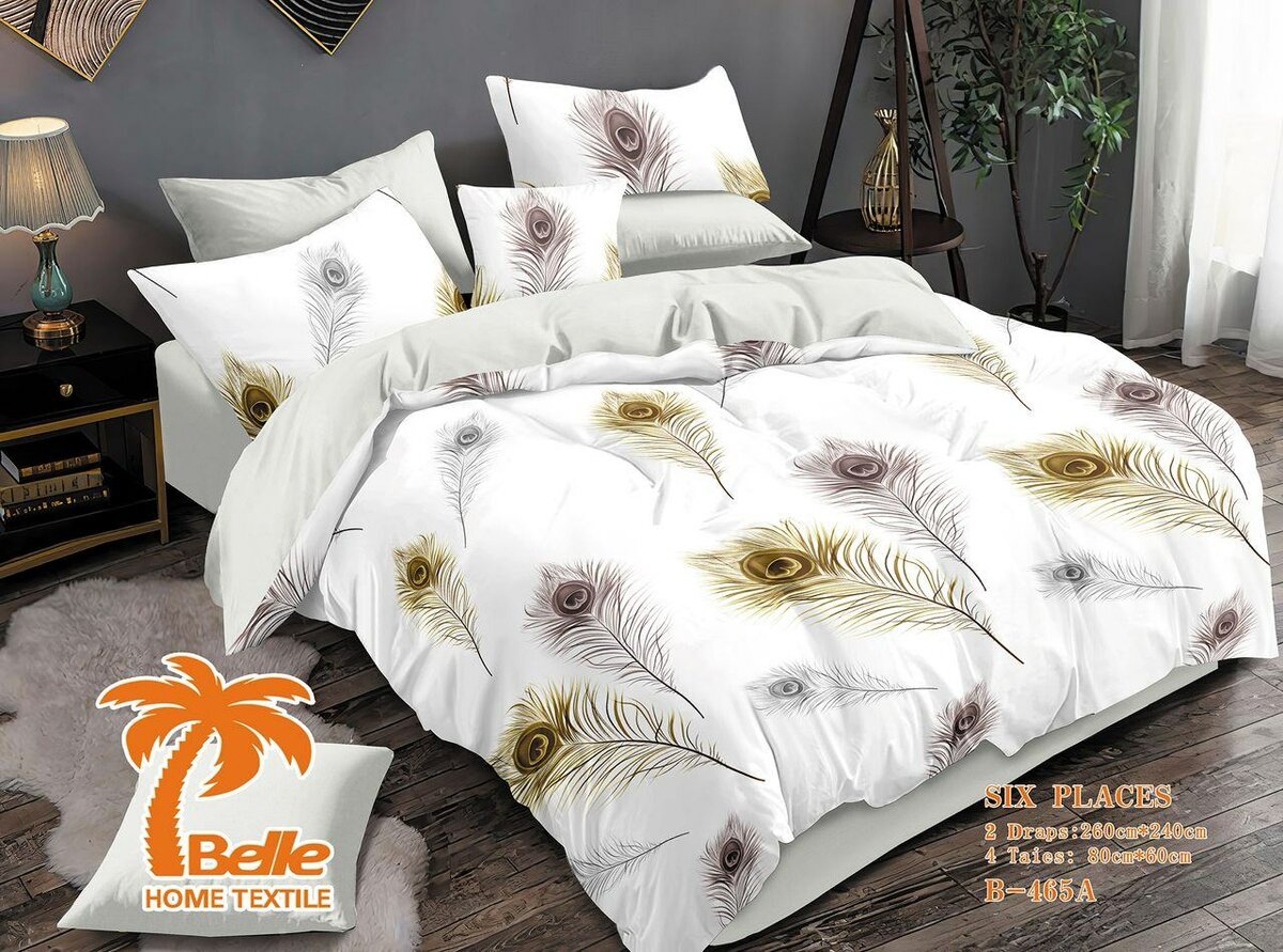 Parure de lit en textile doux avec imprimé plumes de paon. Convient pour 6 personnes. Inclut 4 taies d'oreiller et 1 housse de couette. Parfait pour une chambre élégante.