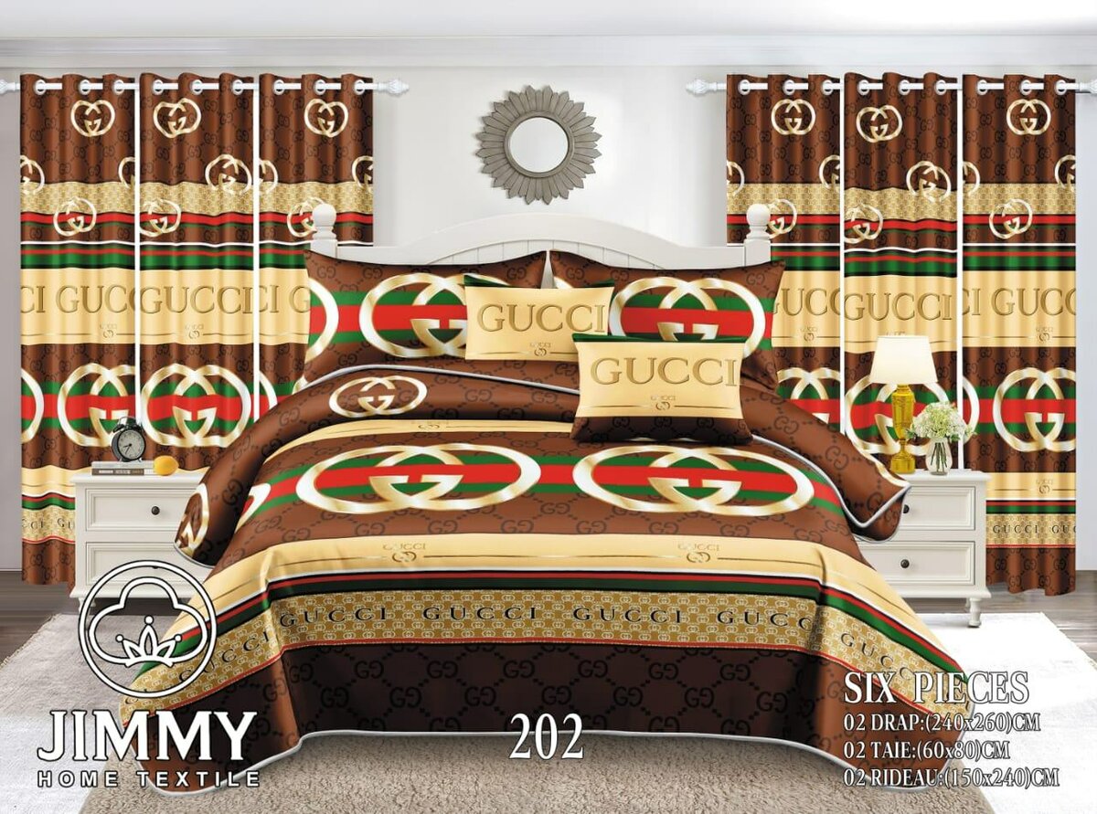 Parure de lit luxueuse avec housse de couette et taies d'oreiller assorties, inspirée des motifs Gucci et Louis Vuitton. Confectionnée en matériaux de haute qualité pour un confort optimal. Parfaite pour les amoureux de la mode et du luxe.