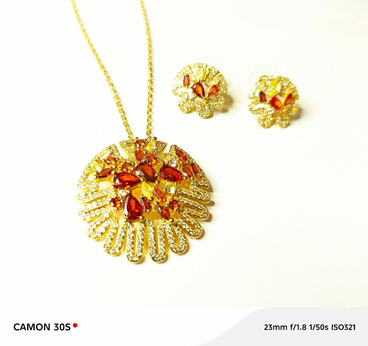 Sublime parure dorée avec collier et boucles d'oreilles. Idéale pour événements spéciaux ou cadeaux. Bijoux ornés de pierres éclatantes pour un look raffiné et chic.