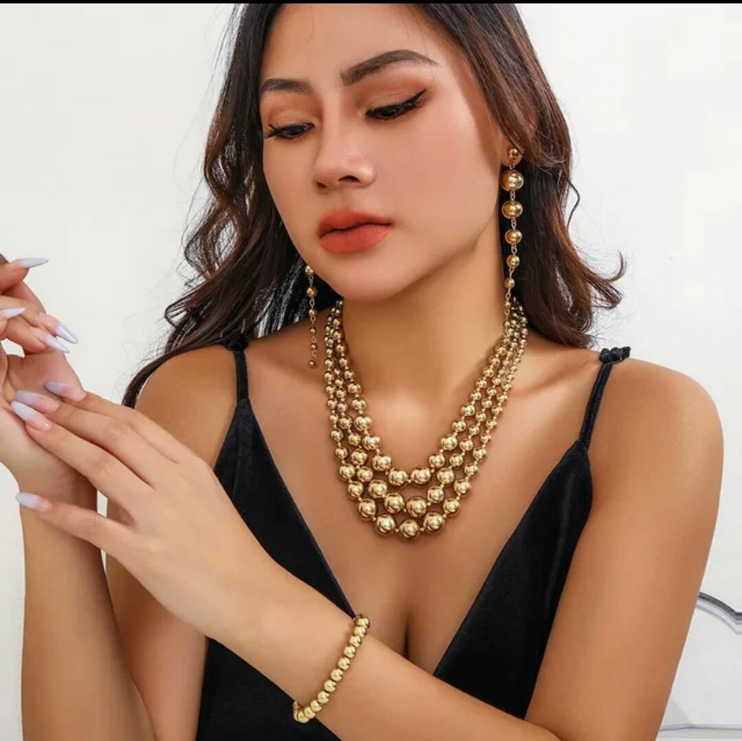 Sublimez votre tenue avec cette parure élégante en perles dorées et argentées. Composée d'un collier multi-rangs, de boucles d'oreilles pendantes et d'un bracelet assorti, elle est idéale pour des occasions spéciales ou une soirée glamour. Offrez-vous une touche d'élégance intemporelle et soyez au centre de l'attention. Parfaite pour compléter votre look de fête et attirer tous les regards.