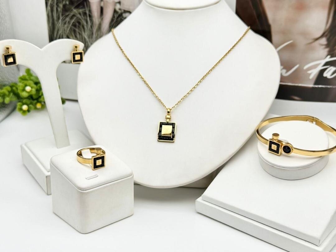 Élégante parure bijou en or comprenant collier, bague, boucles d'oreilles et bracelet. Idéal pour ajouter une touche de luxe à vos tenues. Un choix parfait pour des occasions spéciales ou un cadeau inoubliable.
