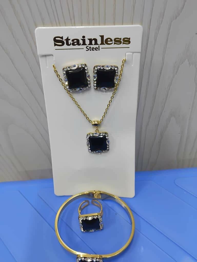 Découvrez cette parure élégante en acier inoxydable, composée d'un collier, boucles d'oreilles, bracelet et bague. Parfait pour ajouter une touche raffinée à votre tenue, ses pierres sombres et son design sophistiqué en font un choix idéal pour les occasions spéciales ou le quotidien.