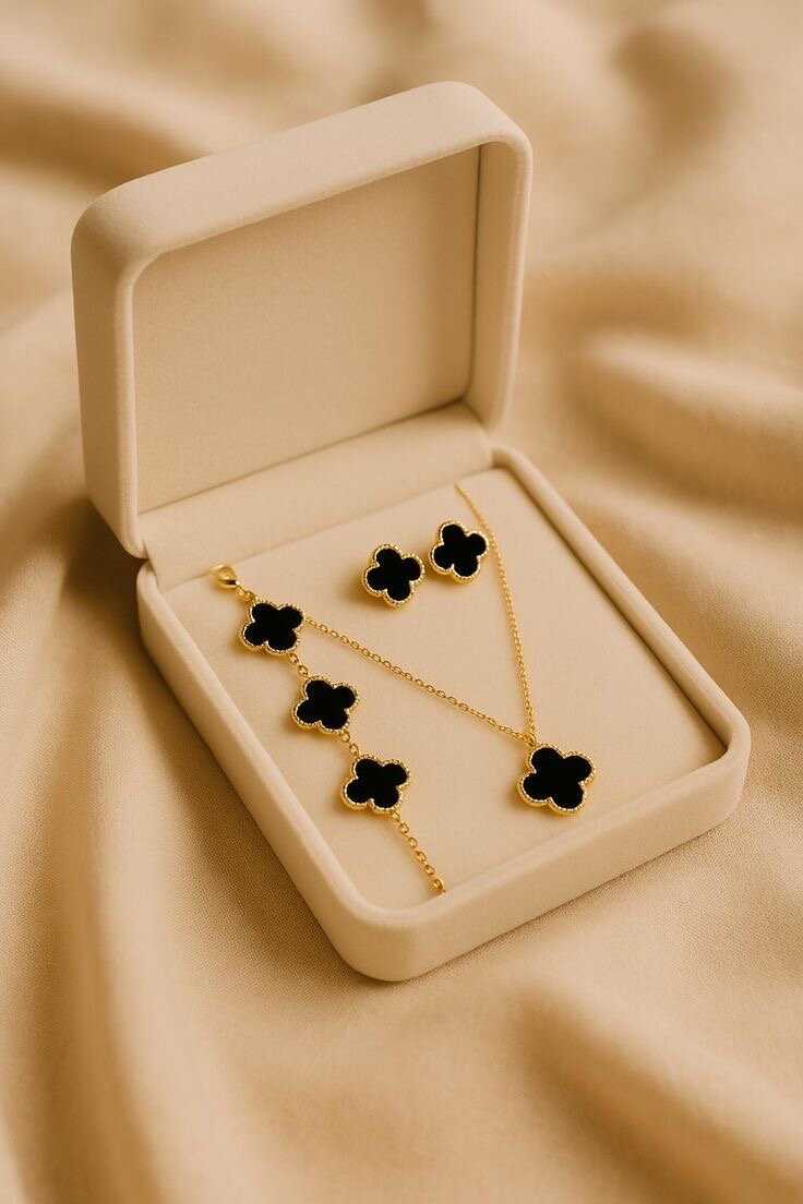 Élégante parure en acier inoxydable avec pendentif, bracelet et boucles d'oreilles à motif fleur. Idéale pour toutes les occasions spéciales. Résistante et hypoallergénique.