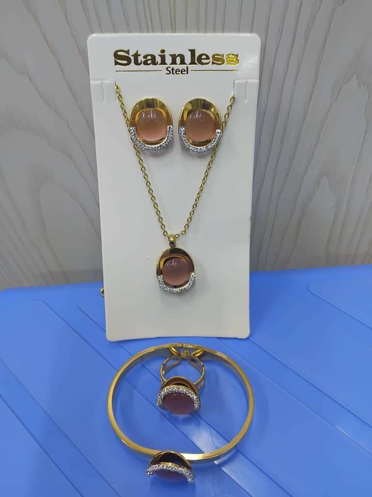 Élevez votre élégance avec cette magnifique parure en acier inoxydable, comprenant un collier, une paire de boucles d’oreilles et un bracelet. Parfait pour les occasions spéciales ou au quotidien, cet ensemble allie durabilité et style raffiné.