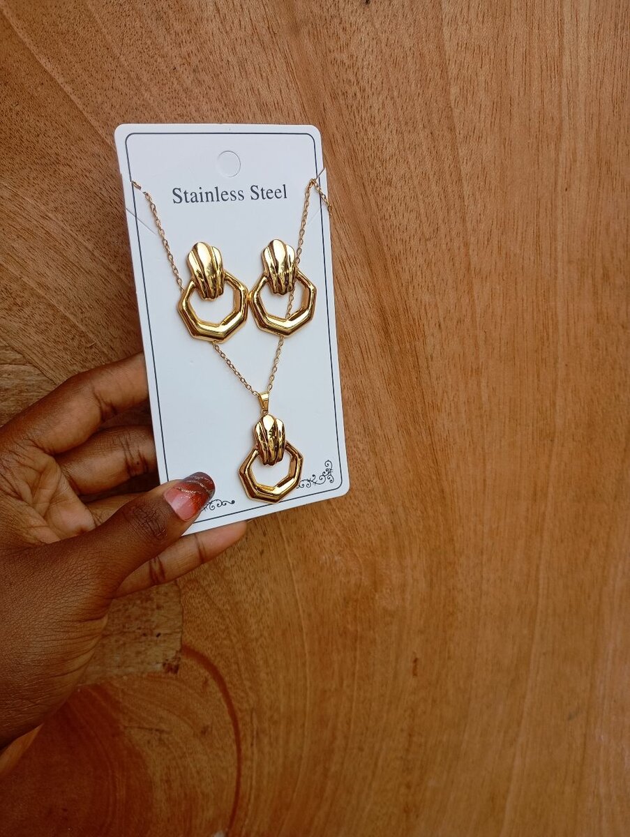 Élégante parure en acier inoxydable doré, comprenant un collier et des boucles d'oreilles assorties. Parfait pour ajouter une touche de glamour à votre tenue quotidienne ou pour des occasions spéciales. Anti-allergique et durable.