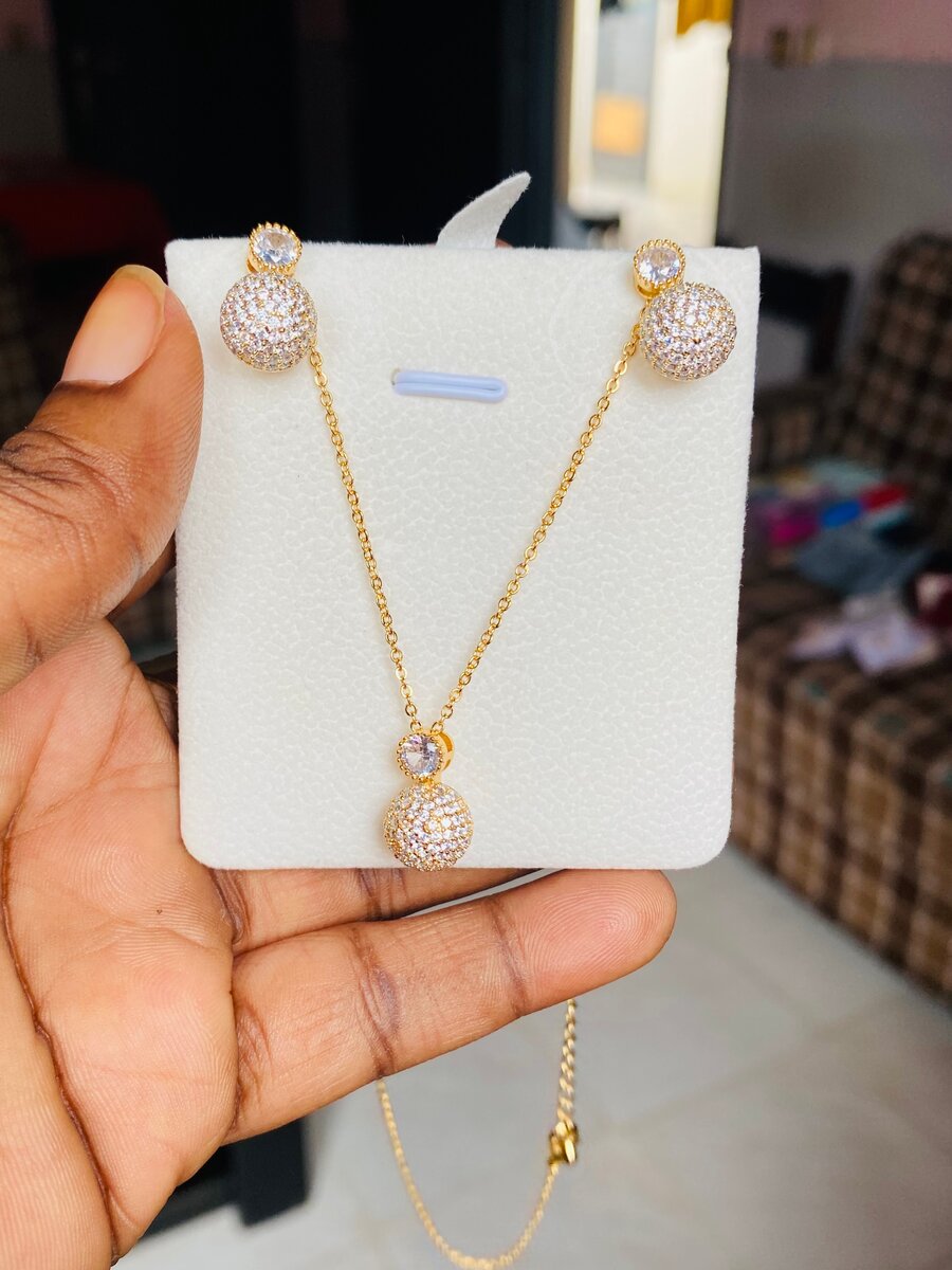 Cette parure élégante comprend un collier en oo plaqué avec des pendentifs scintillants et des boucles d'oreilles assorties. Idéale pour ajouter une touche de glamour à vos tenues de soirée ou comme cadeau parfait pour un être cher. Finitions délicates et design raffiné pour une allure sophistiquée.