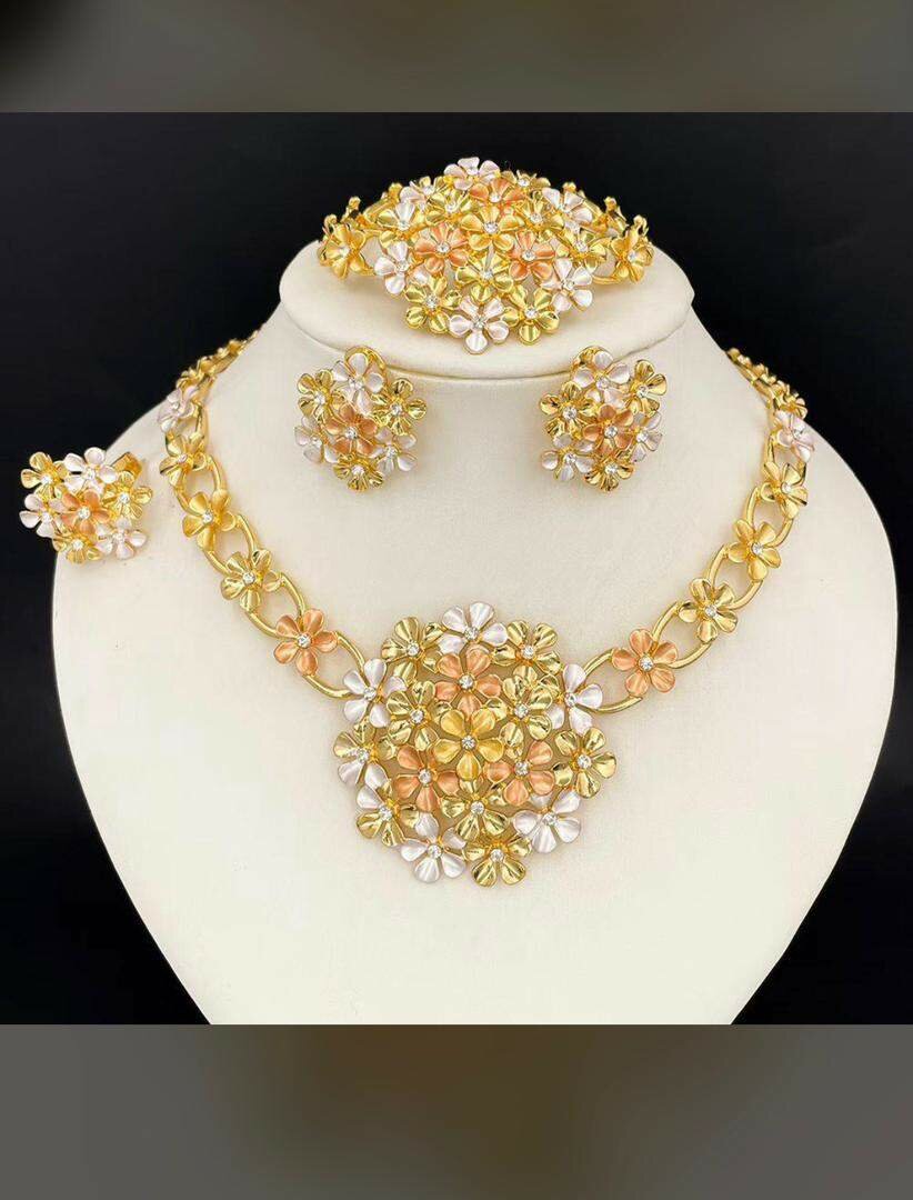 Sublime parure de bijoux florale dorée et argentée, parfaite pour des occasions spéciales. Comprend un collier, des boucles d'oreilles, une bague et un bracelet assortis. Ajoutez une touche d'élégance et de raffinement à votre tenue avec ce set étincelant, idéal pour mariages et soirées glamour.