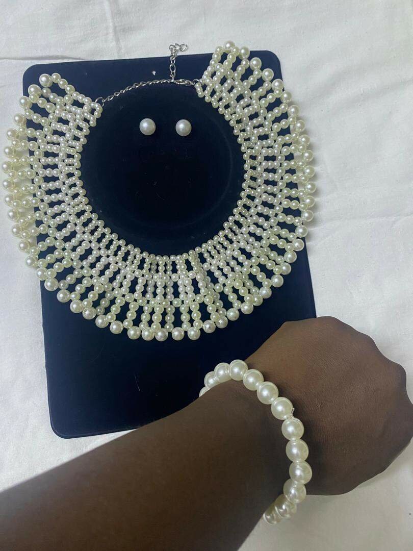 Éblouissante parure de bijoux en perles, comprenant un collier multi-rang et des boucles d’oreilles assorties. Parfaite pour les occasions spéciales, elle ajoute une touche de sophistication classique.