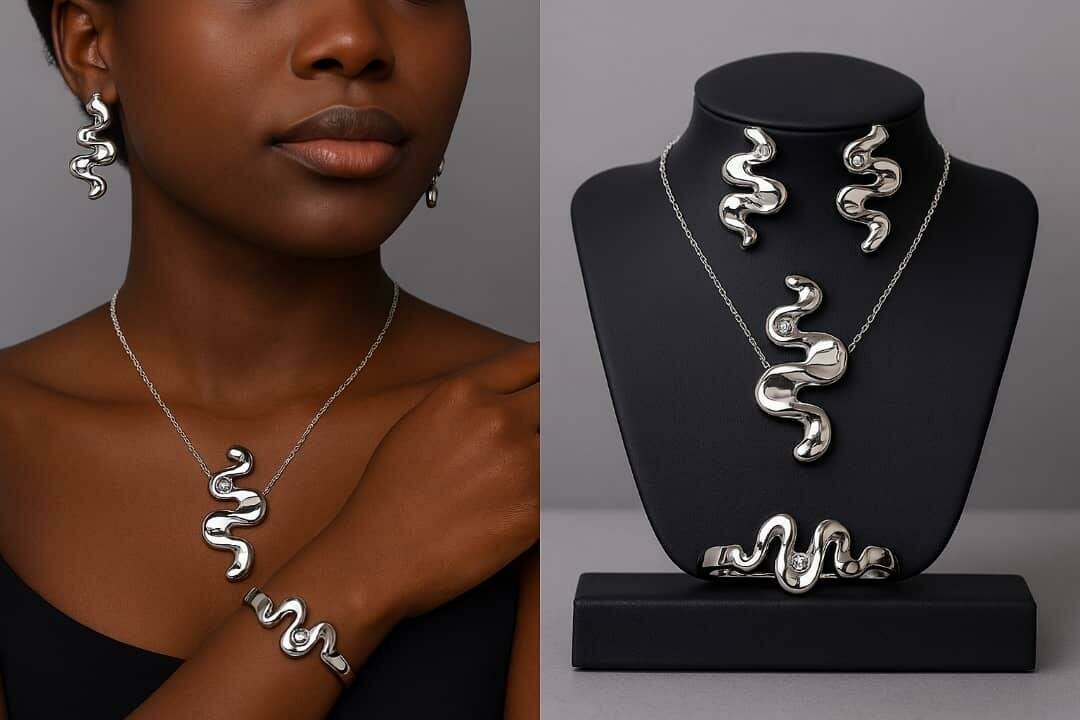 Élégante parure serpent argentée composée d'un collier, bracelet et boucles d'oreilles. Conçue pour ajouter une touche audacieuse et stylée à toute tenue. Idéale pour les soirées et événements spéciaux. Finition brillante et design unique qui attirera tous les regards.