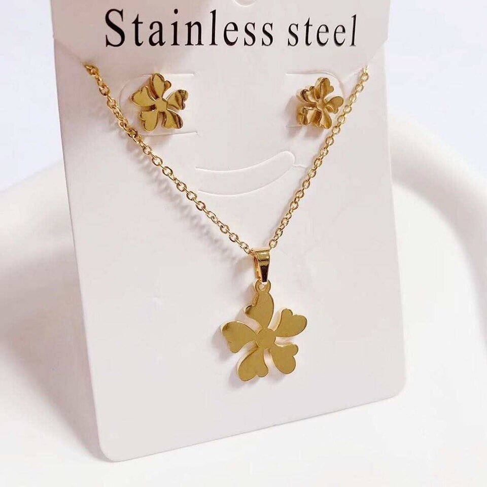 Ajoutez une touche d'élégance à votre tenue avec cette parure en acier inoxydable doré. Comprend un collier pendentif trèfle et des boucles d'oreilles assorties. Idéal pour toutes les occasions, ce bijou résistant est un cadeau parfait et intemporel.