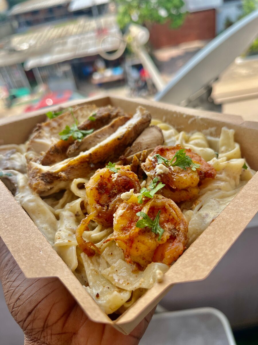 Pâtes crémeuses, poulet, jambon, gambas et du fromage