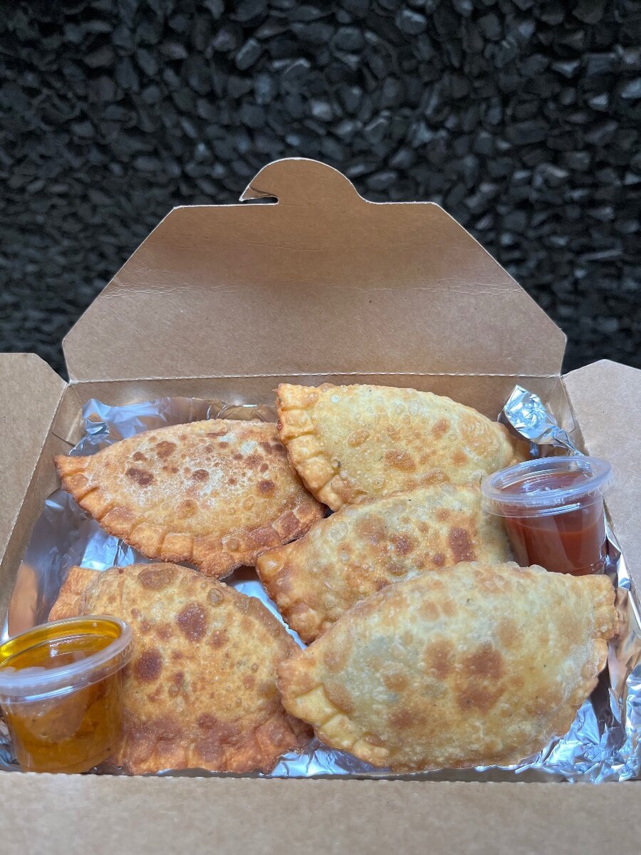 Cinq pastels généreux, farcis à la viande hachée ou au jambon, avec fromage fondant et béchamel. Accompagnés dun pot de piment et de ketchup pour relever le tout. Un vrai régal salé !