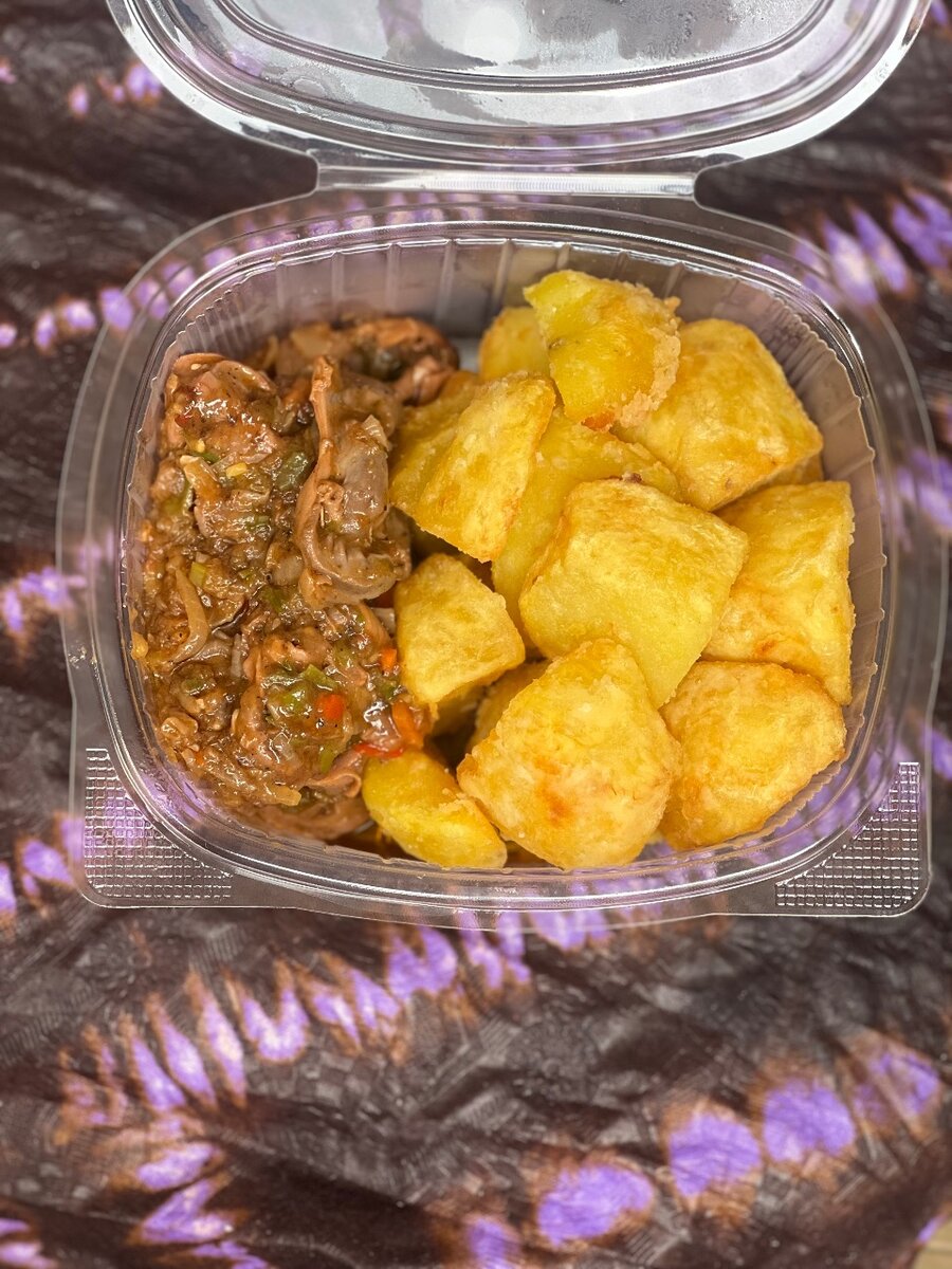 Pattes de poulet bien nettoyées, sautées avec des gésiers tendres, marinées dans un mélange dépices maison. Servies bien chaudes, prêtes à déguster. Portion généreuse pour une personne.