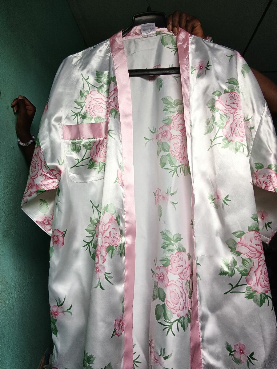 Élégant peignoir en satin blanc avec motif floral rose. Doux et confortable, idéal pour des moments de détente à la maison. Parfait pour offrir en cadeau ou pour se chouchouter. Disponible en plusieurs tailles.