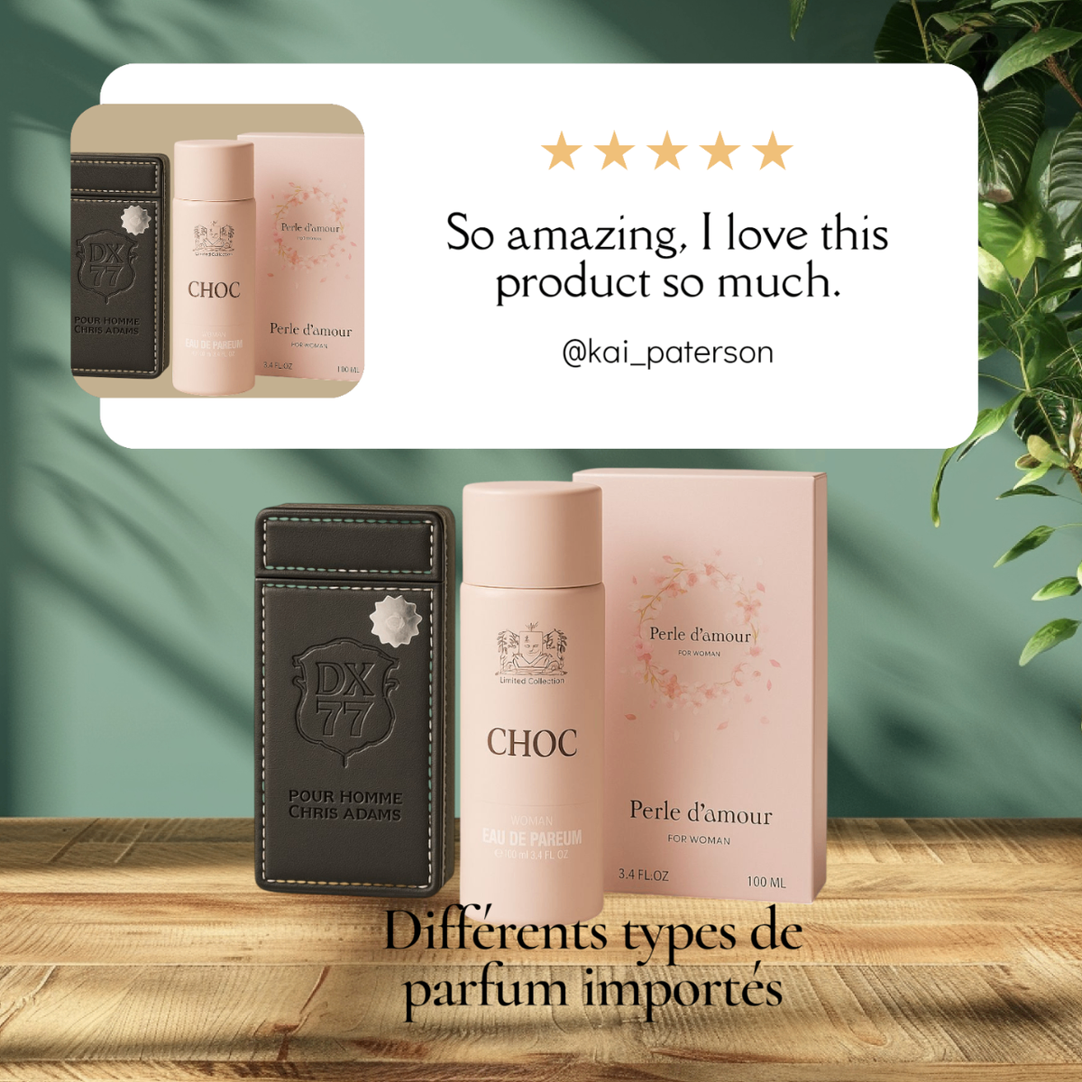 Découvrez les différents parfums sophistiqués Perle d'Amour,Chris adams,et Choc ,Idéal pour une touche élégante et irrésistible au quotidien. Des Flacons élégants, class,et parfait comme cadeau ou pour se faire plaisir. Commandez maintenant pour une expérience olfactive unique et pour une odeur unique !