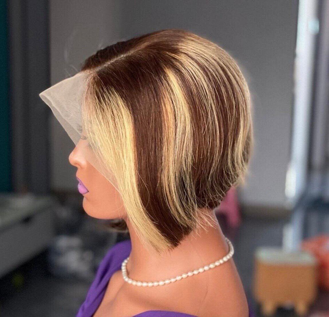 Découvrez cette magnifique perruque courte de style bob, idéale pour un look chic et moderne. Ses racines foncées et pointes claires offrent un contraste élégant. Parfaite pour changer de style facilement.