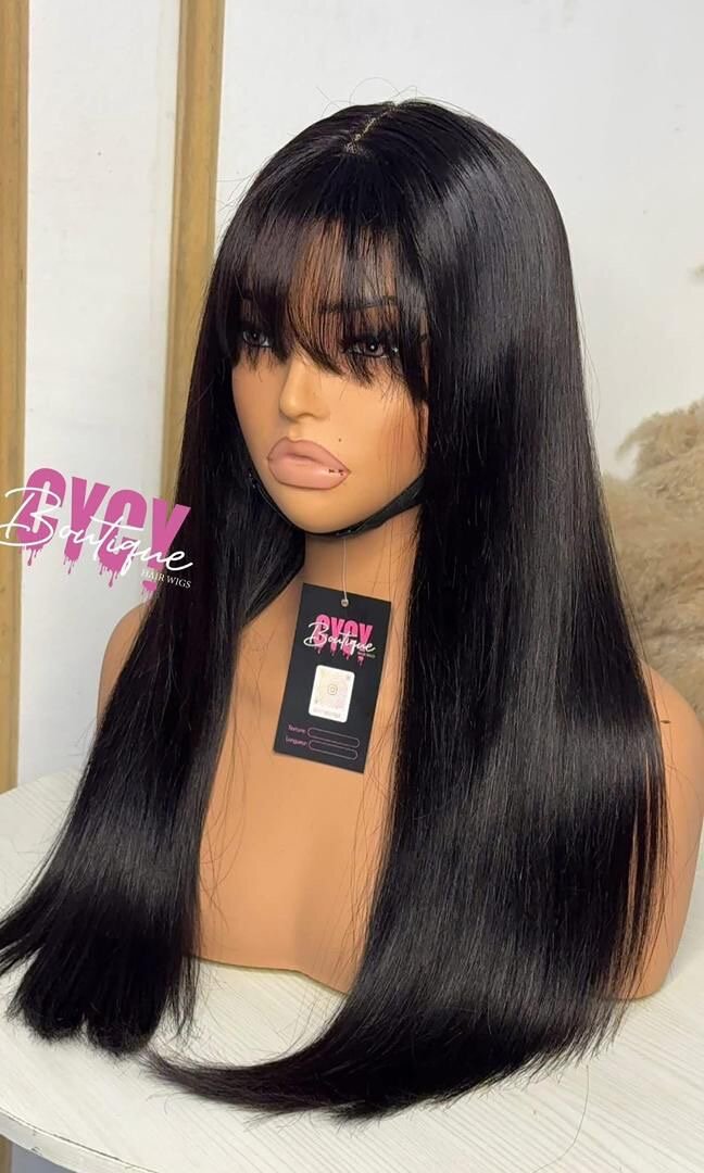 Découvrez cette superbe perruque lisse et élégante avec frange, parfaite pour transformer instantanément votre look. Facile à coiffer et confortable à porter, elle convient à toutes les occasions.