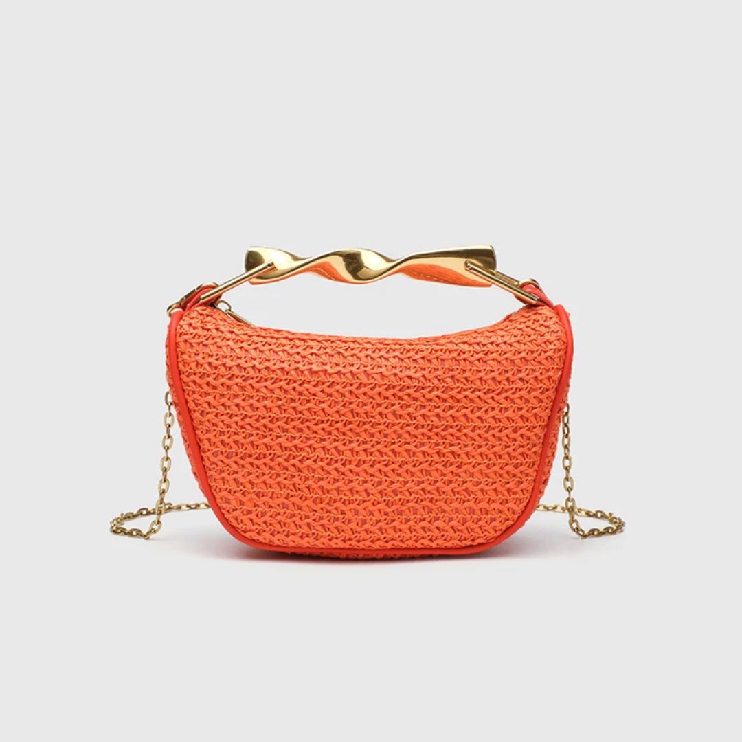 Petit sac en paille inspiration zara a manche dorée avec deux cordes. Couleur moins flashy que sur l image. L orange tire plus sur la teracotta