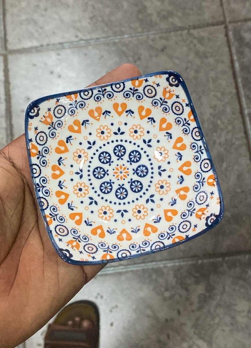 Élégante petite assiette en céramique avec motif floral bleu et orange. Idéale pour présenter des apéritifs ou pour un usage décoratif. Parfaite pour embellir votre table ou étagère. Un ajout charmant à tout intérieur.