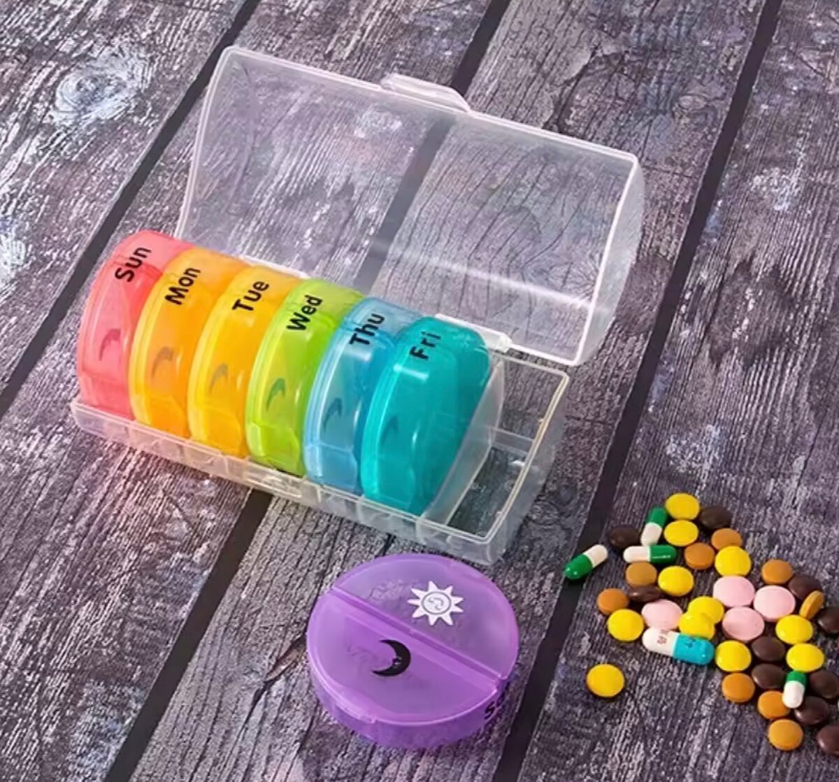 Organisez vos médicaments avec style grâce à ce pilulier hebdomadaire coloré. Sept compartiments individuels pour chaque jour de la semaine, facile à transporter et parfait pour une utilisation quotidienne, à la maison ou en déplacement.