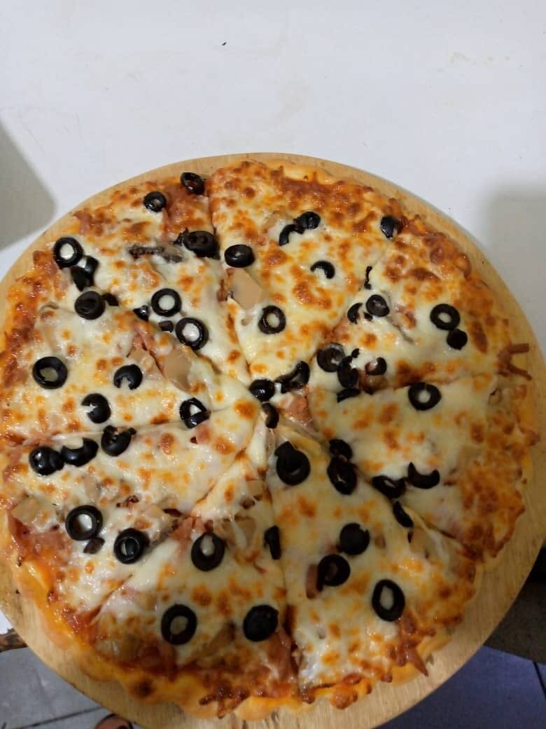 Savourez cette délicieuse pizza garnie de fromage fondant et d'olives noires. Parfaite pour un dîner en famille ou entre amis. Prête à être dégustée !