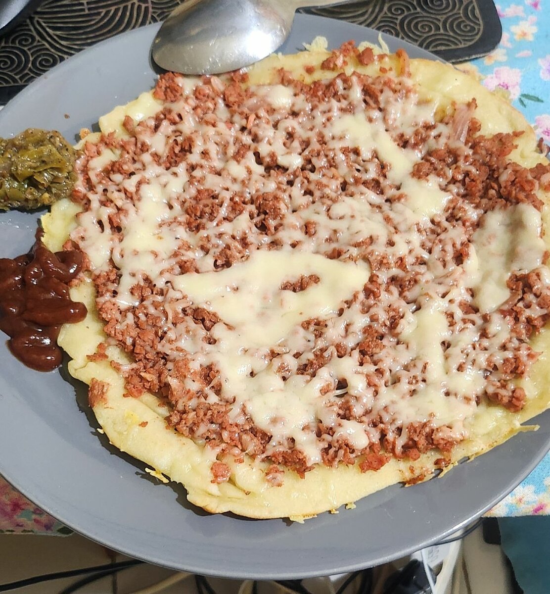 Savourez cette délicieuse pizza maison garnie de viande hachée et de fromage fondant. Parfait pour un repas convivial, cette pizza généreuse est idéale pour les soirées entre amis ou en famille. Accompagnée de sauces savoureuses, elle ravira les amateurs de bonne cuisine. Faites maison pour un goût authentique et savoureux, elle est le choix parfait pour un moment gourmand.