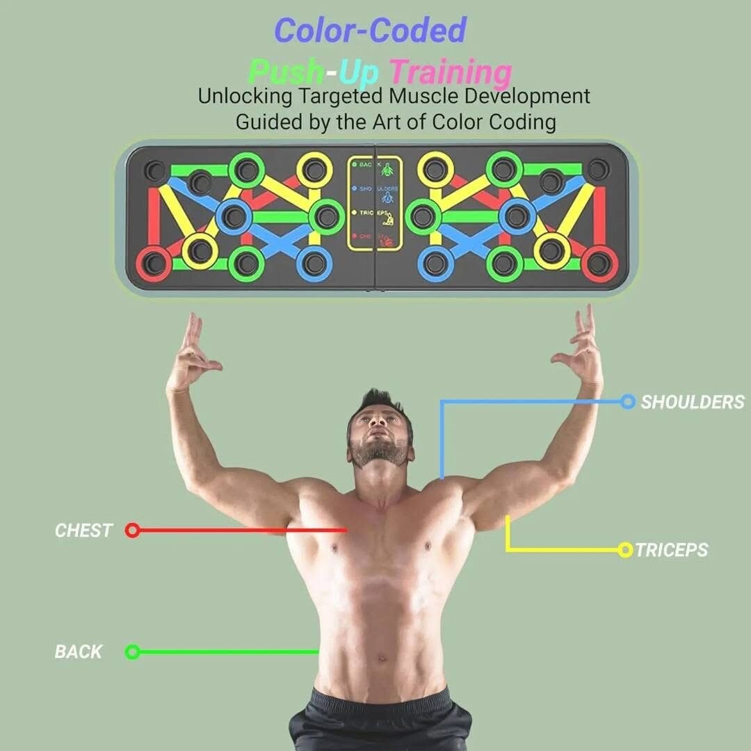 Améliorez votre entraînement avec la planche de push-up pliable colorée. Ciblez vos muscles grâce au code couleur pour un développement musculaire optimal. Compacte et idéale pour la maison, elle convient à tous les niveaux sportifs.