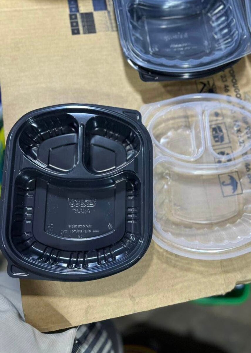Reusable and convenient plastic containers with separate compartments for food storage and serving. Made from durable plastic, perfect for takeaway, meal prep, and on-the-go. Available in black and clear.