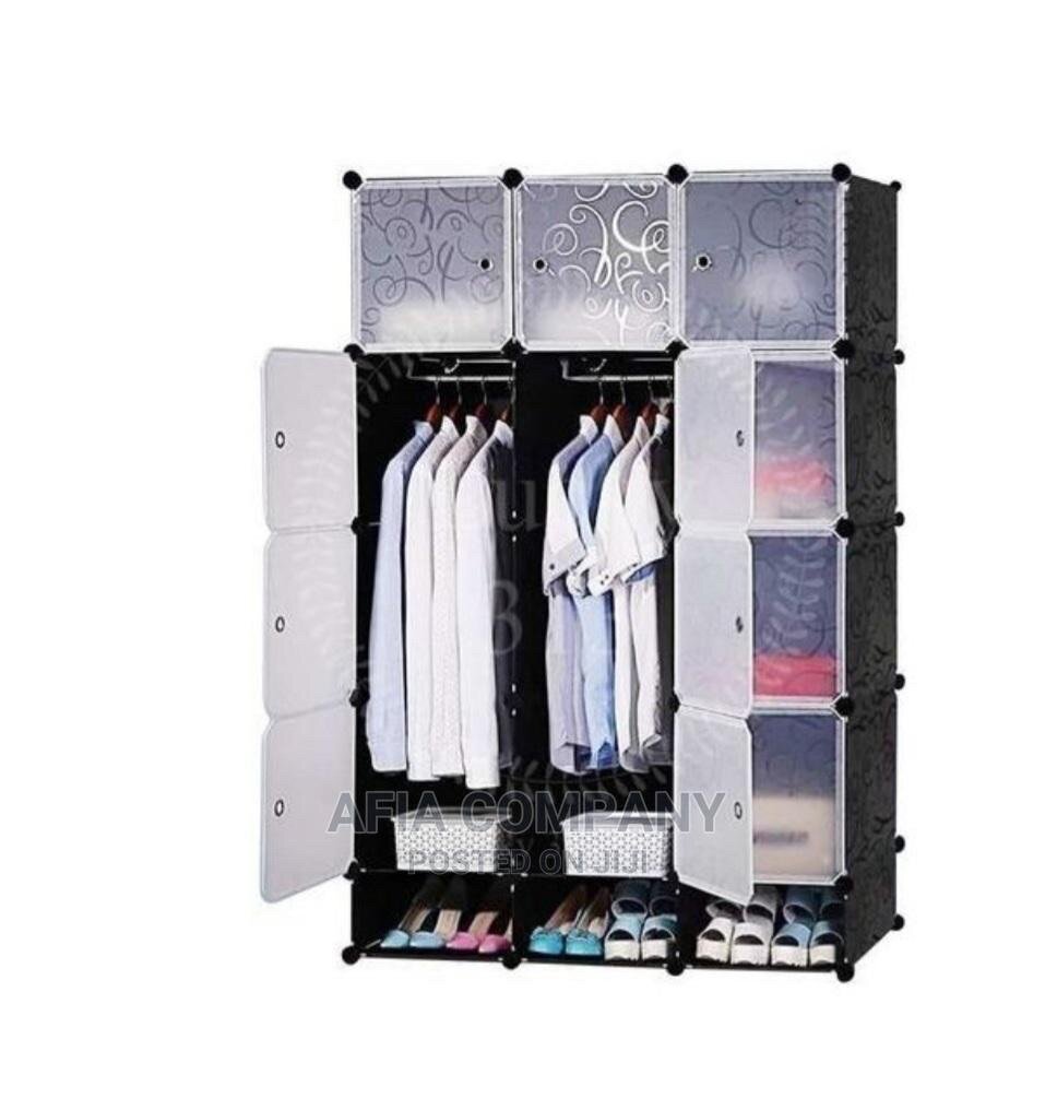 A modern plastic wardrobe with hanger and shoe rack underneath.
