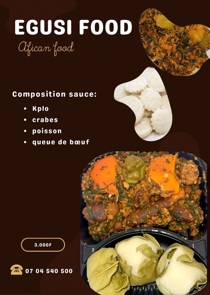 Délicieux plat africain avec sauce Egusi, accompagné d'Akassa et Abolo. Savourez un mélange raffiné de kpô, crabe, poisson et queue de bœuf. Idéal pour un repas exotique et nourrissant.