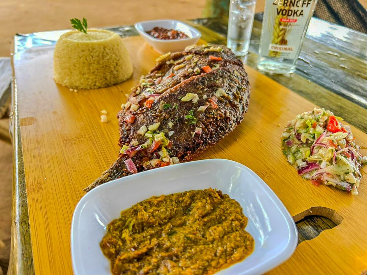 Savourez ce délicieux poisson grillé épicé, accompagné de légumes croquants et de sauces savoureuses. Parfait pour un dîner exotique et épicé, idéal pour ceux qui aiment les saveurs authentiques et les repas copieux.