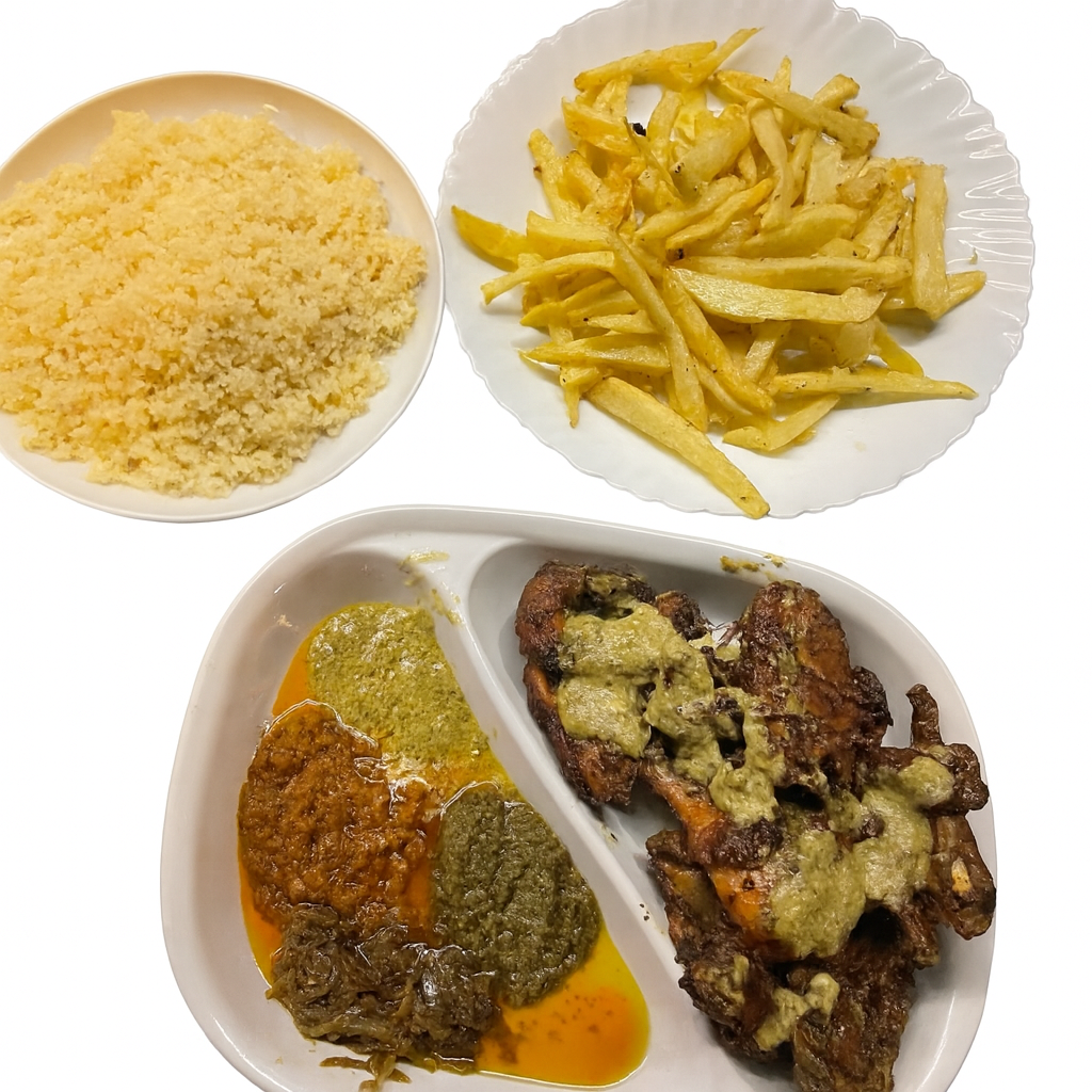 Découvrez notre plat délicieux de poulet grillé mayo épicé accompagné de frites croustillantes et d attieke