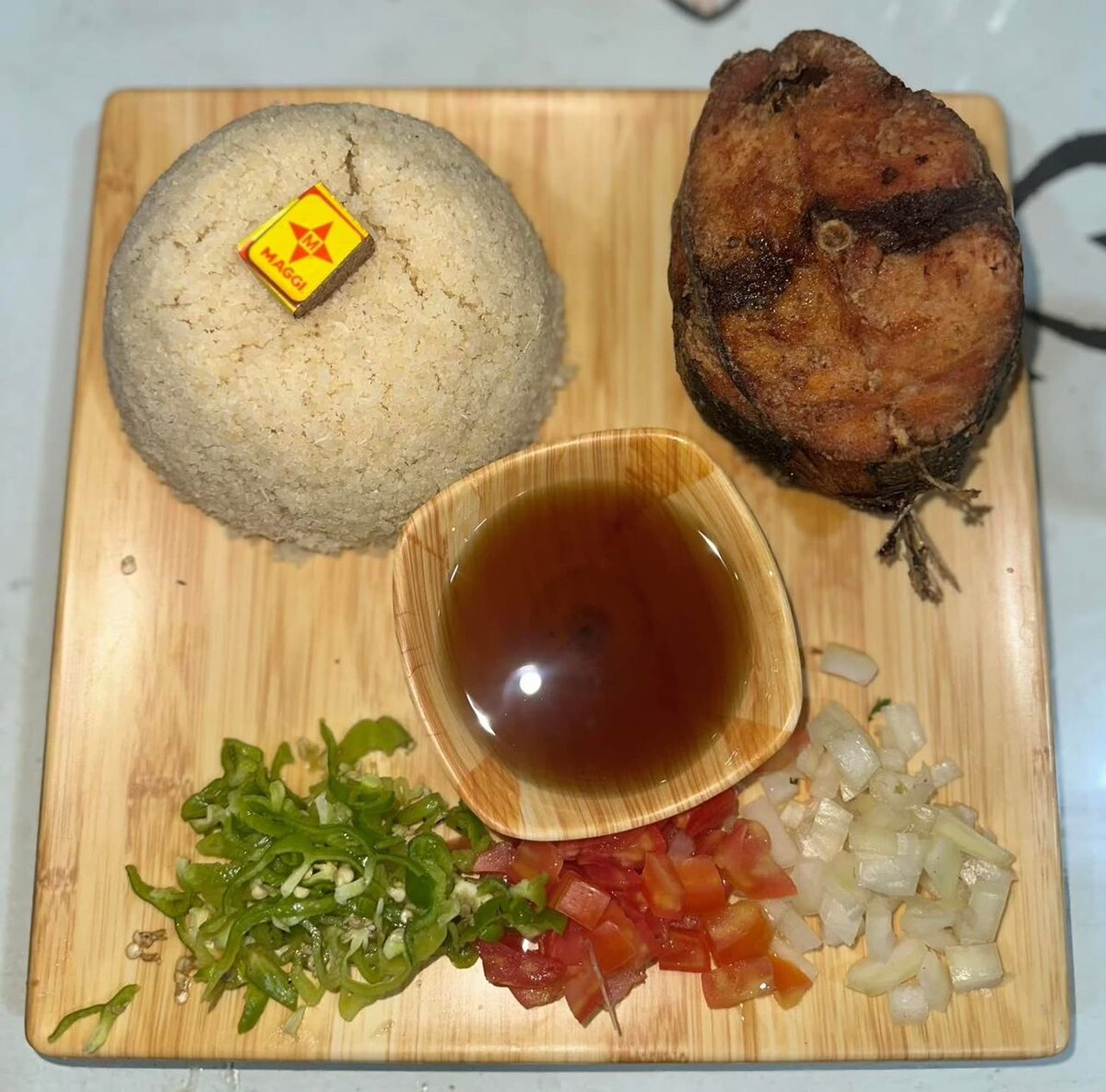 Savourez ce délicieux plat de riz accompagné de poisson frit croustillant. Parfaitement assaisonné avec des légumes frais et une sauce épicée pour une expérience gustative intense. Idéal pour un repas copieux et savoureux, adapté pour les amateurs de cuisine exotique.