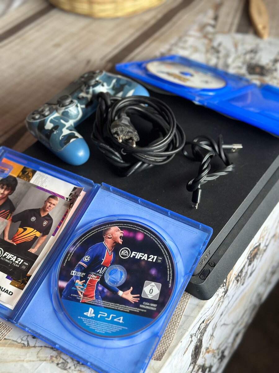 Ps4 slim de couleur noire en très bonne état avec un CD de fifa 21 et un CD de Naruto Storm 4. Avec aussi une manette bleue treillis où toutes les touches sont fonctionnelles. Le seul défaut de cette manette, c´est qu´elle se décharge un peu vite que la norme.