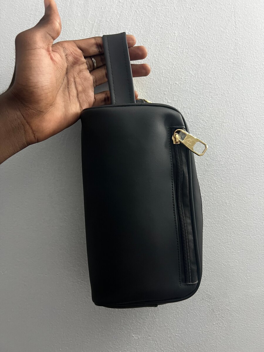 Gardez vos essentiels organisés avec cette trousse de toilette élégante en simili cuir noir. Idéale pour les voyages ou la salle de bain, elle intègre une fermeture éclair dorée et une poignée pratique. Un accessoire indispensable pour ceux qui apprécient le style et la fonctionnalité.