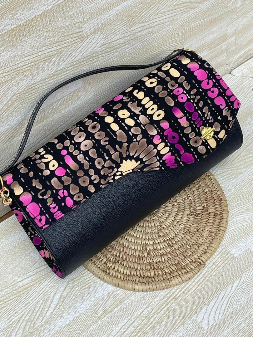 Ajoutez une touche d'élégance à votre tenue avec cette pochette en cuir élégant. Idéale pour les soirées ou les événements spéciaux, elle combine un design moderne avec un imprimé vibrant. Facile à transporter grâce à sa bandoulière.