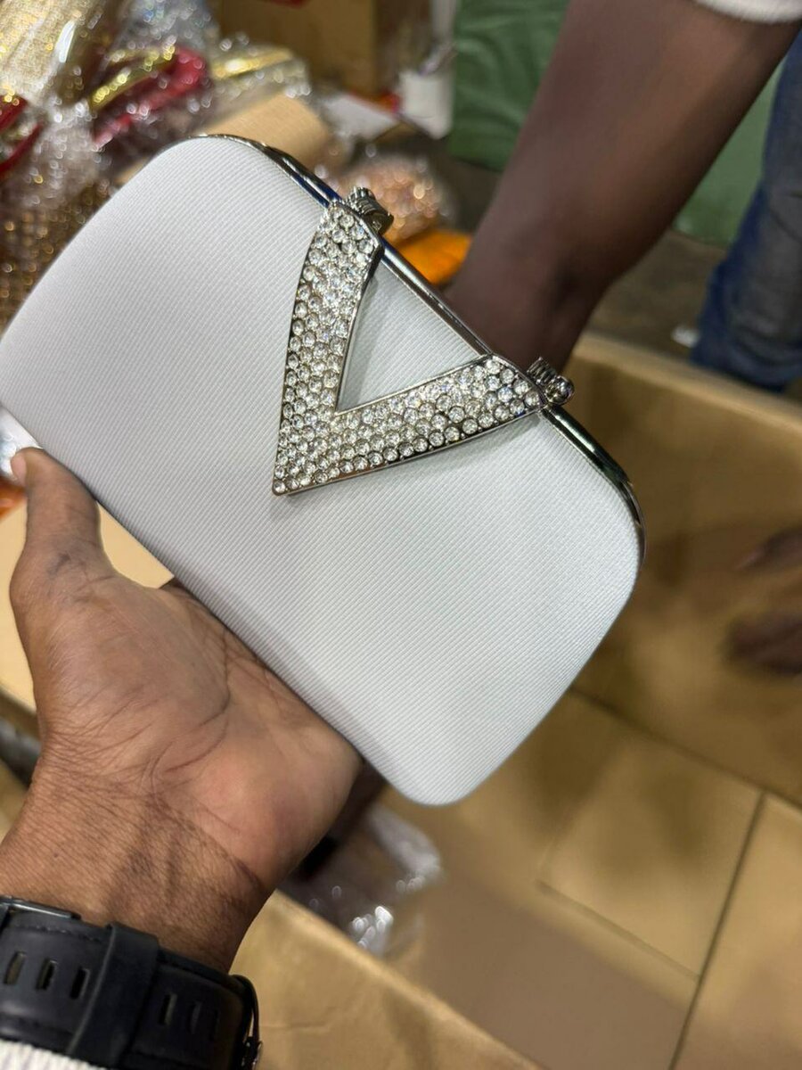 Élégante pochette blanche ornée de strass scintillants, parfaite pour compléter votre tenue de soirée. Compacte et chic, elle offre assez d'espace pour vos essentiels tout en ajoutant une touche de glamour à votre look.