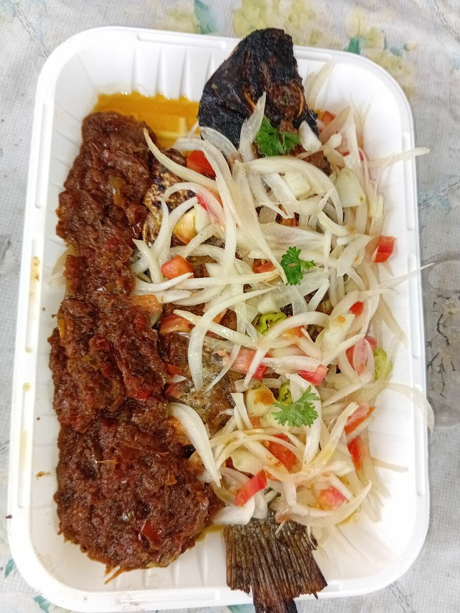 Découvrez notre poisson braisé savoureux, accompagné d'une sauce épicée et de légumes frais. Parfait pour les amateurs de saveurs piquantes et authentiques.