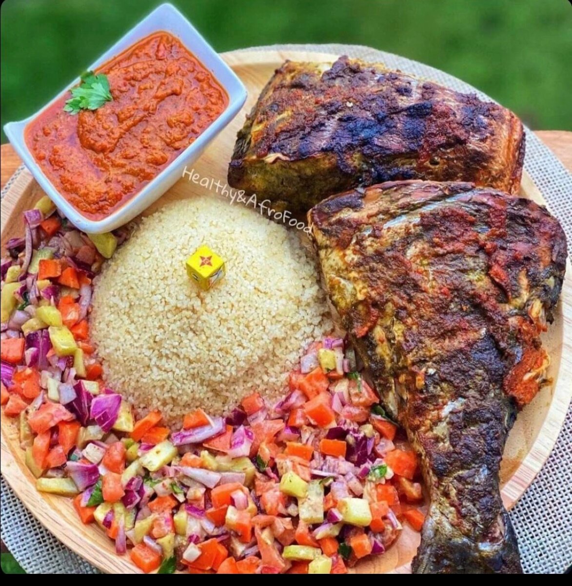 Savourez un délicieux plat de poisson braisé accompagné attieke et de légumes frais, parfait pour un repas équilibré et savoureux