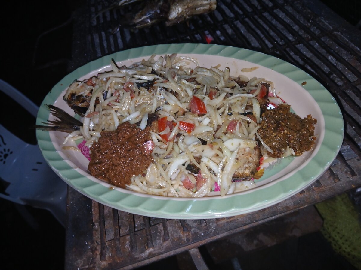 Découvrez notre poisson grillé épicé, parsemé d'oignons croquants et relevé de délicieuses épices. Idéal pour un repas savoureux et convivial, ce plat exotique est parfait pour les amateurs de cuisine épicée.