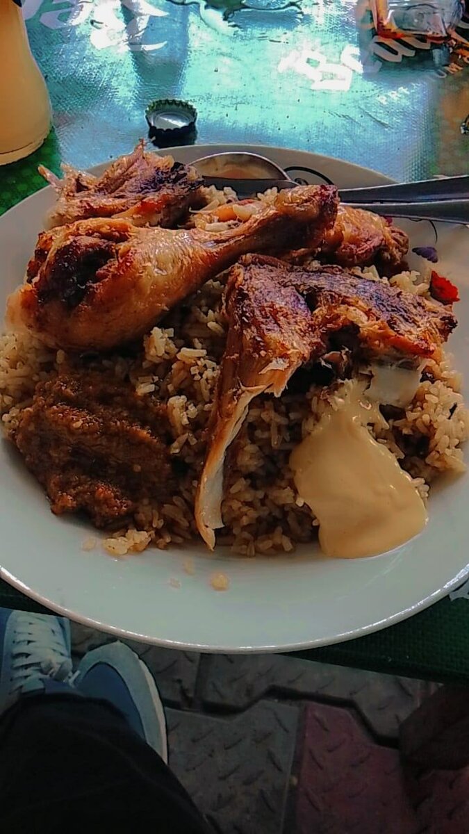Découvrez un savoureux plat de poisson grillé accompagné de bananes plantain et d'une sauce épicée, ainsi qu'un délicieux poulet mijoté dans une sauce riche. Idéal pour les amateurs de cuisine exotique et épicée, ce repas est parfait pour partager en famille ou entre amis. Profitez de ces saveurs uniques et laissez-vous transporter par cette expérience culinaire.